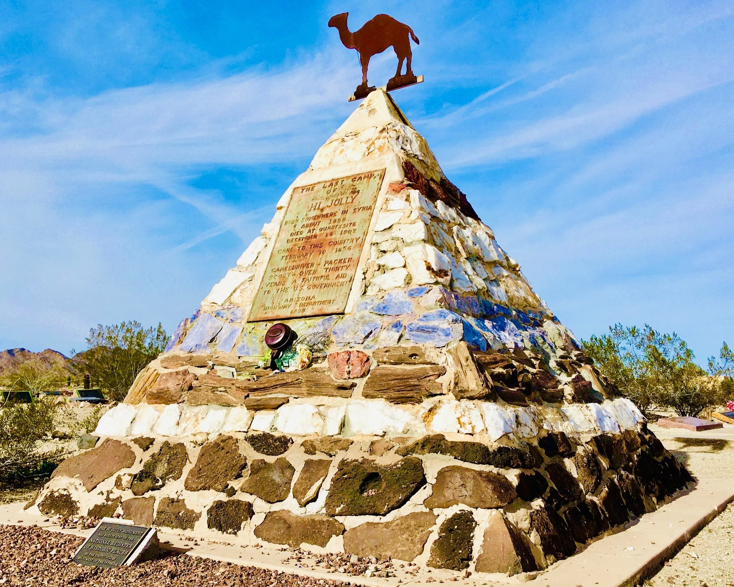 The United States Camel Corps was formed in the mid-19th century to help take control of the land ceded from Mexico. Hi Jolly, whose Quartzsite, Arizona tomb is pictured here, is perhaps the only camelier whose name survives. A plaque on his tomb reads: