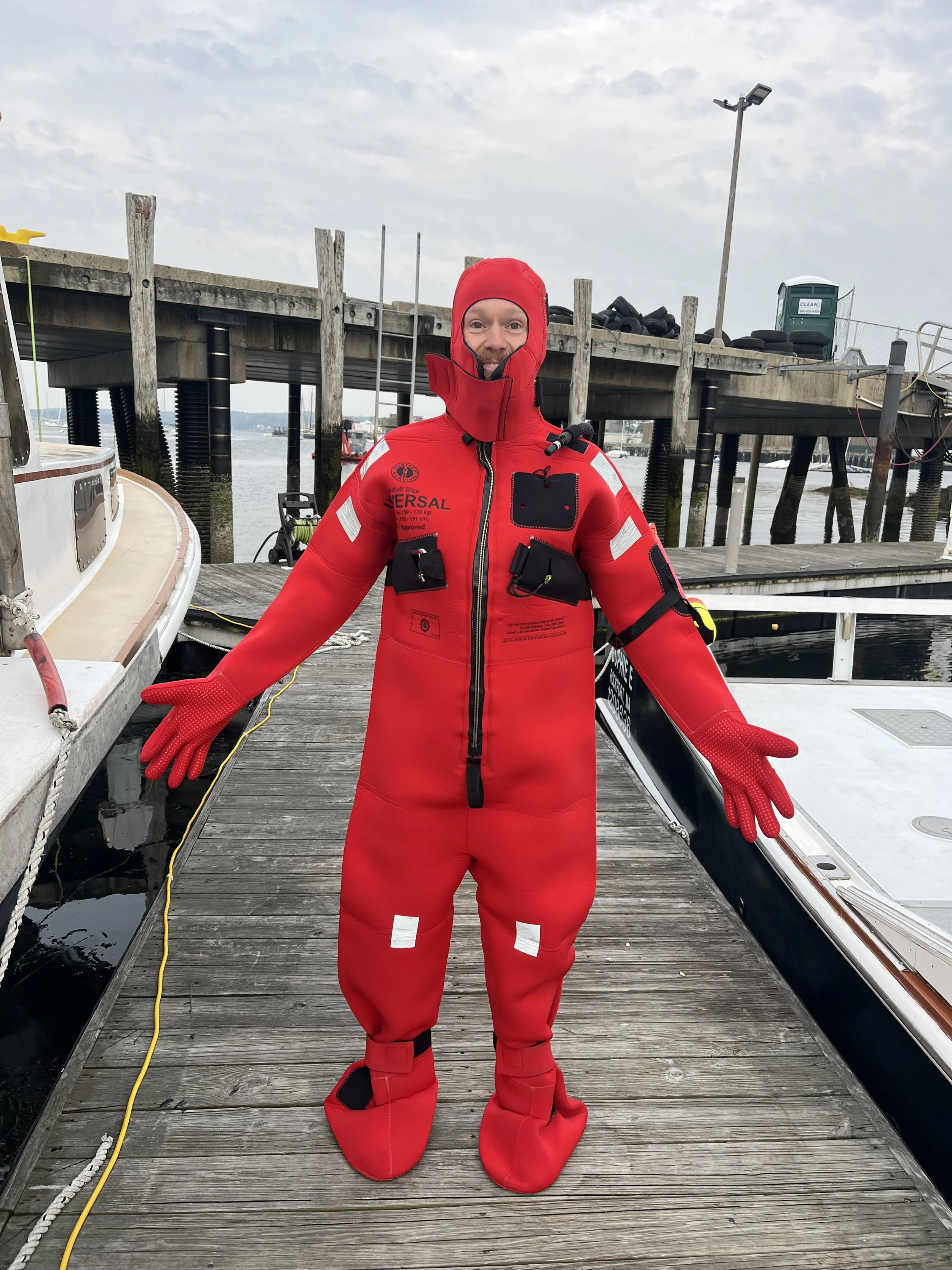 Felix Poon: He has Mike show me how to put on an immersion suit. Then he shows me the life raft, and the life ring. And then, he shows me the buckets.