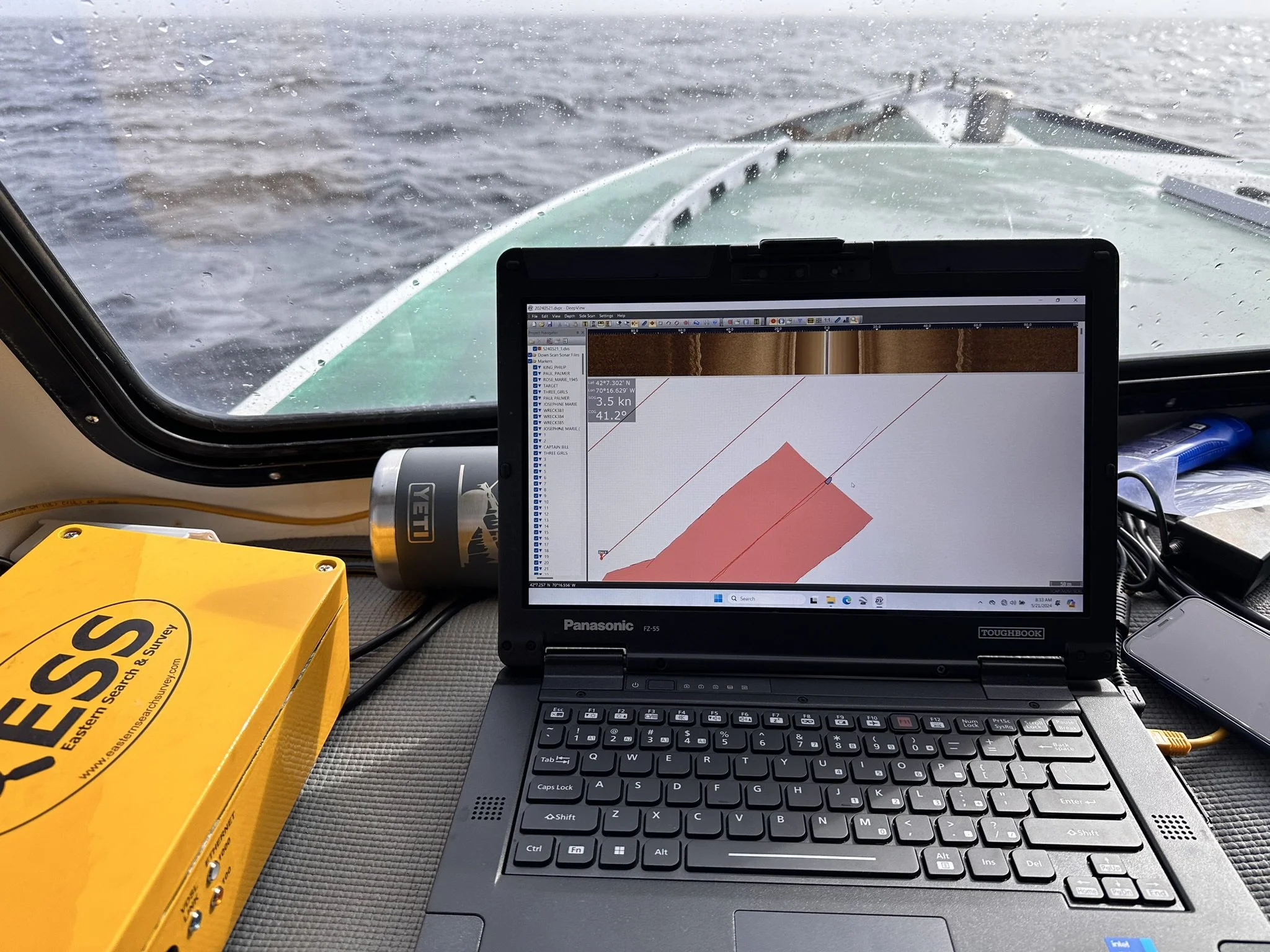 Felix Poon: Tom is taking our boat over a half square mile patch of the ocean. They call this part “mowing the lawn,” which is exactly what it sounds like, except we’re dragging the tow fish behind us, that thing that looks like two torpedoes connected together.