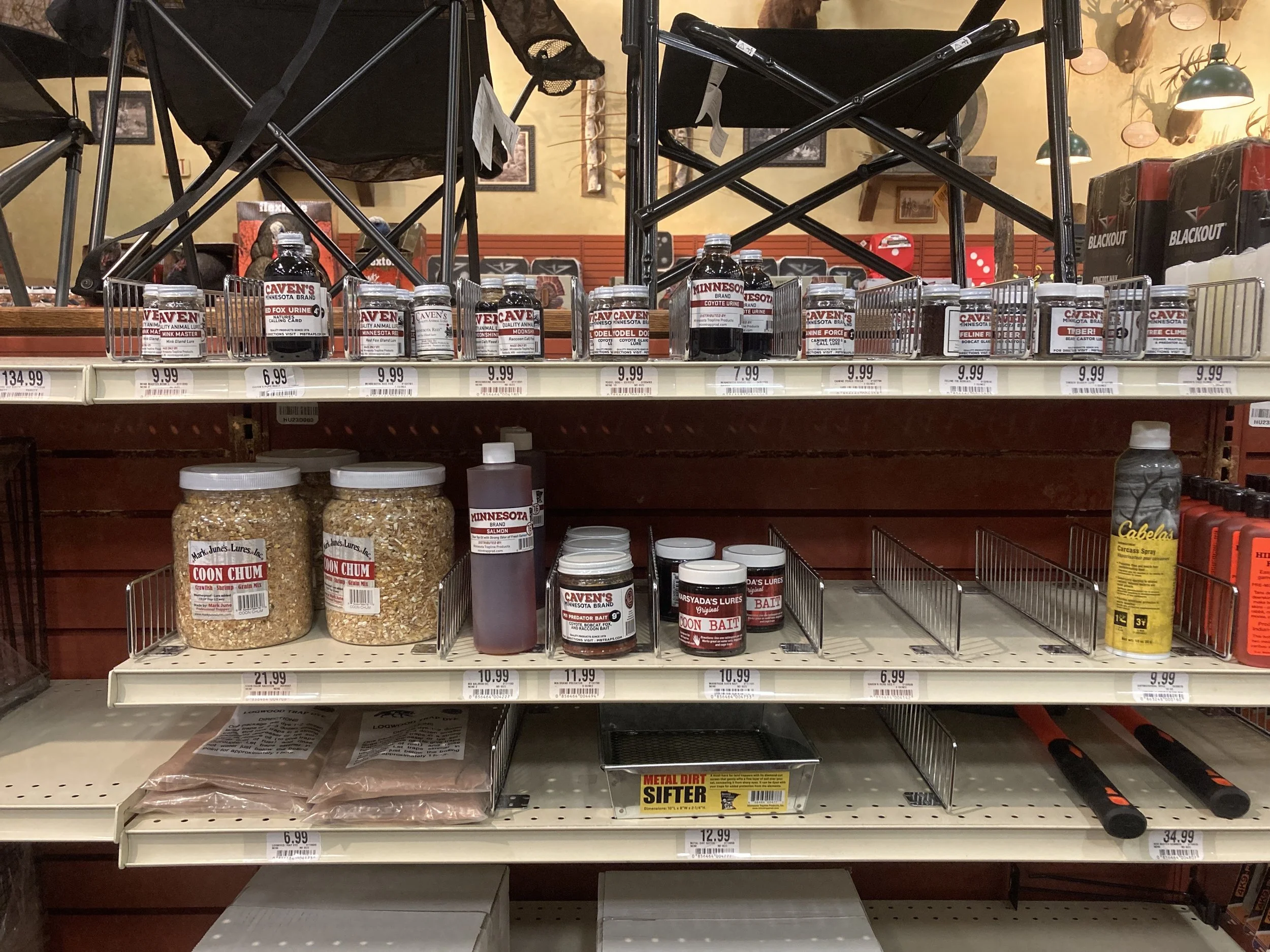 And so when I went to my local bass Pro, I discovered there is a whole section for stuff like this with all sorts of things I never would have imagined. They had red fox urine, beaver, castor oil, something called coon chum.